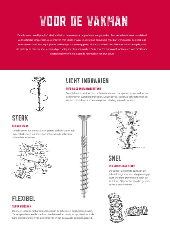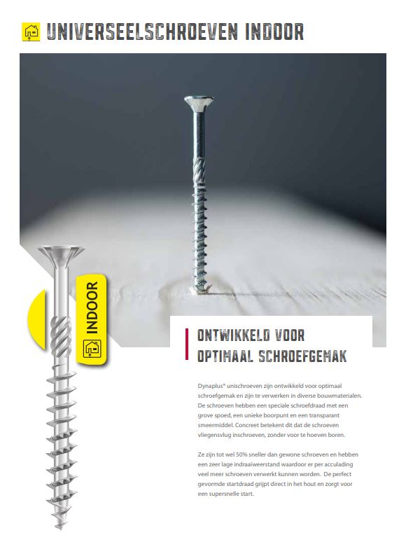 | Informatie | Dynaplus Indoor unischroef Voordelen Dynaplus schroeven: Superlage indraaiweerstand door unile schroefdraad in combinatie met een transparante smeermiddel, dit zorgt voor optimaal schroefgemak, en kunnen veel schroeven per acculading verwerkt worden. Sterk door dat de schroeven gemaakt zijn van gehard carbonstaal, dus geen last dat de schroeven afknappen. Snel super vlug indraaien door de perfect gevormde punt aan de schroef, waardoor hij heel vlug indraaid en door de extra grove spoed gaat het tot wel 50% sneller dan de gewone spaanplaatschroeven. Flexibel door de uitgekiende hardingsproces zijn de schroeven ook heel buigzaam waarmee ze de krachten opvangen van het erken van het hout, hierdoor is de kans op afbreken nog kleiner. |